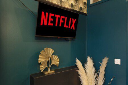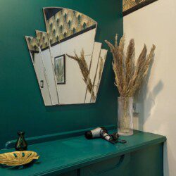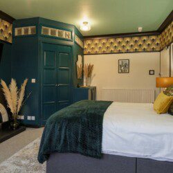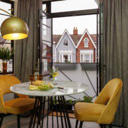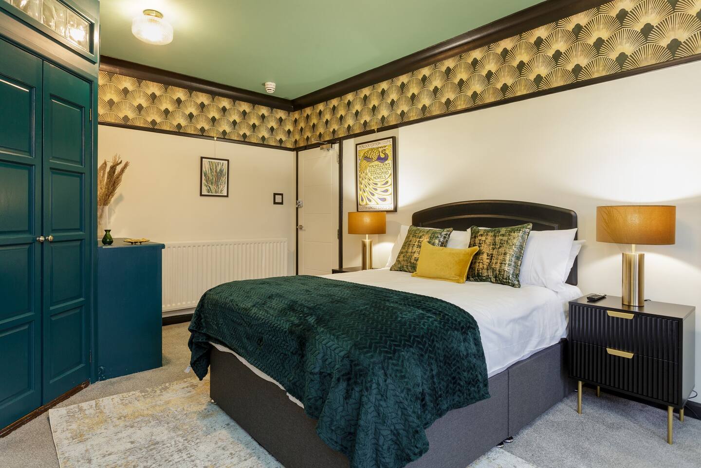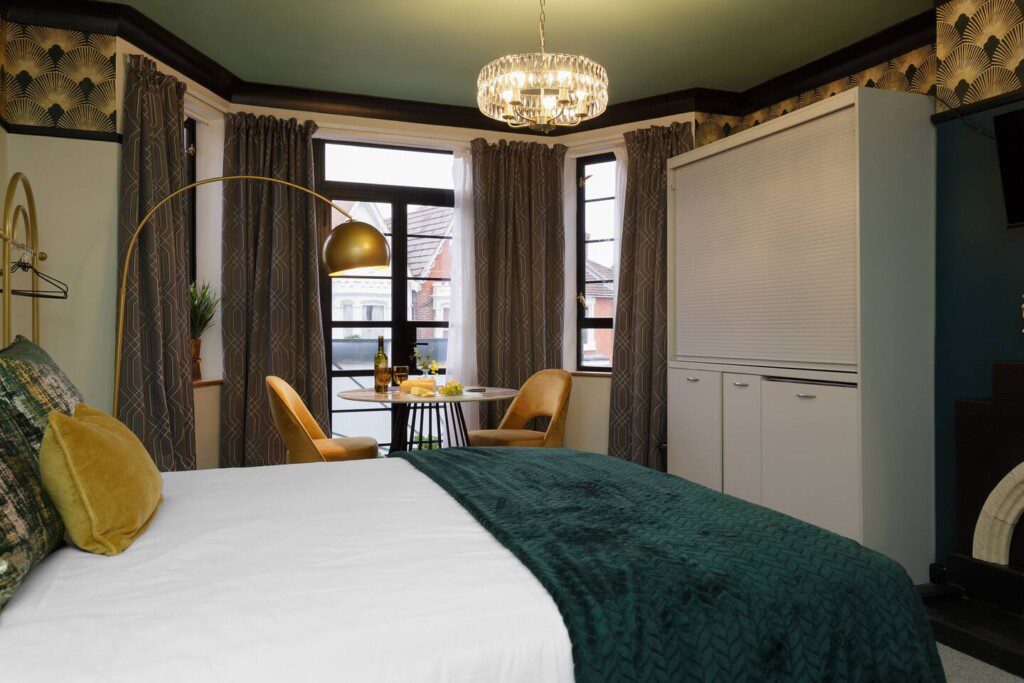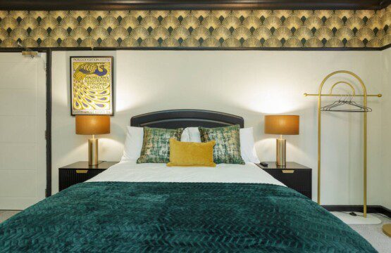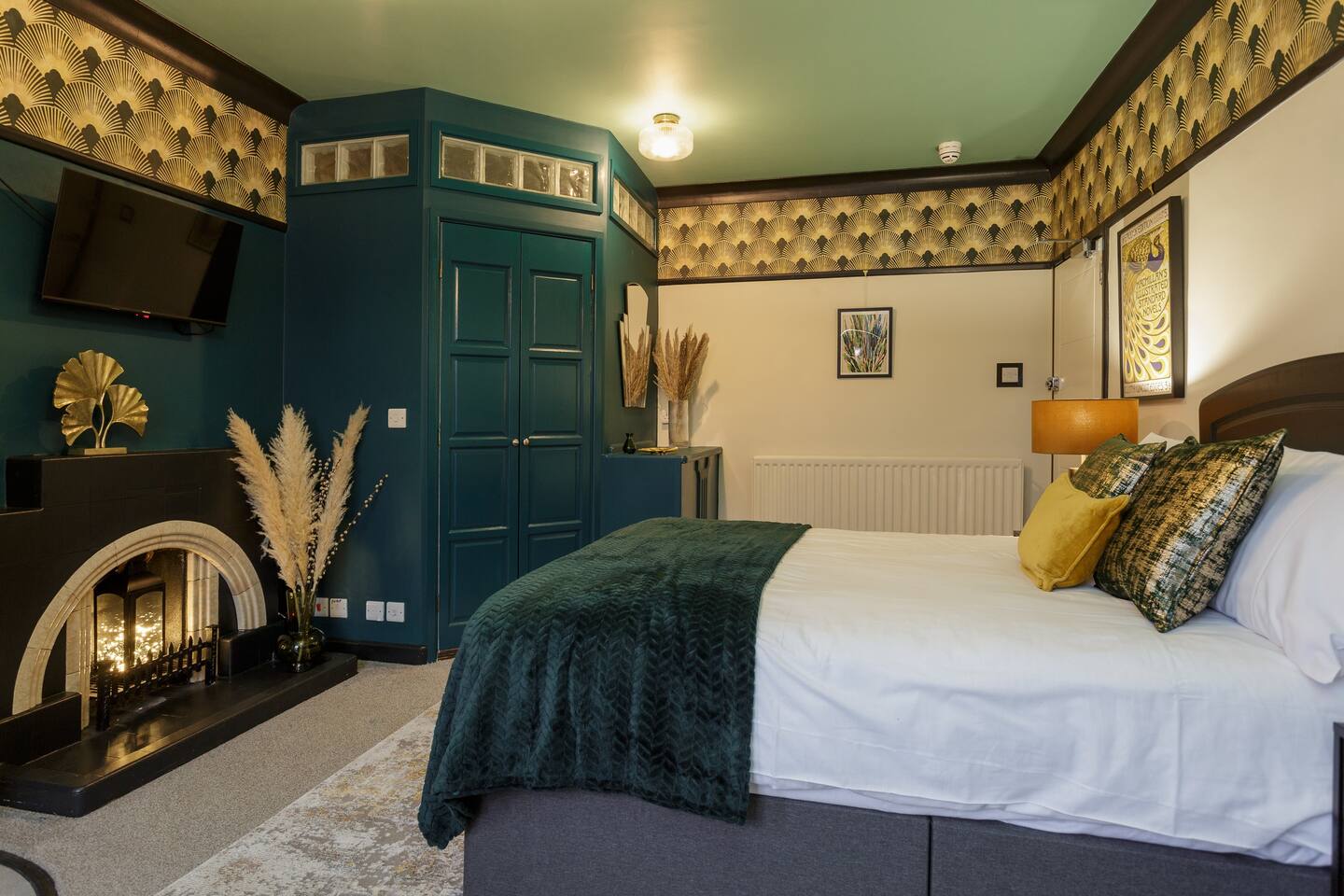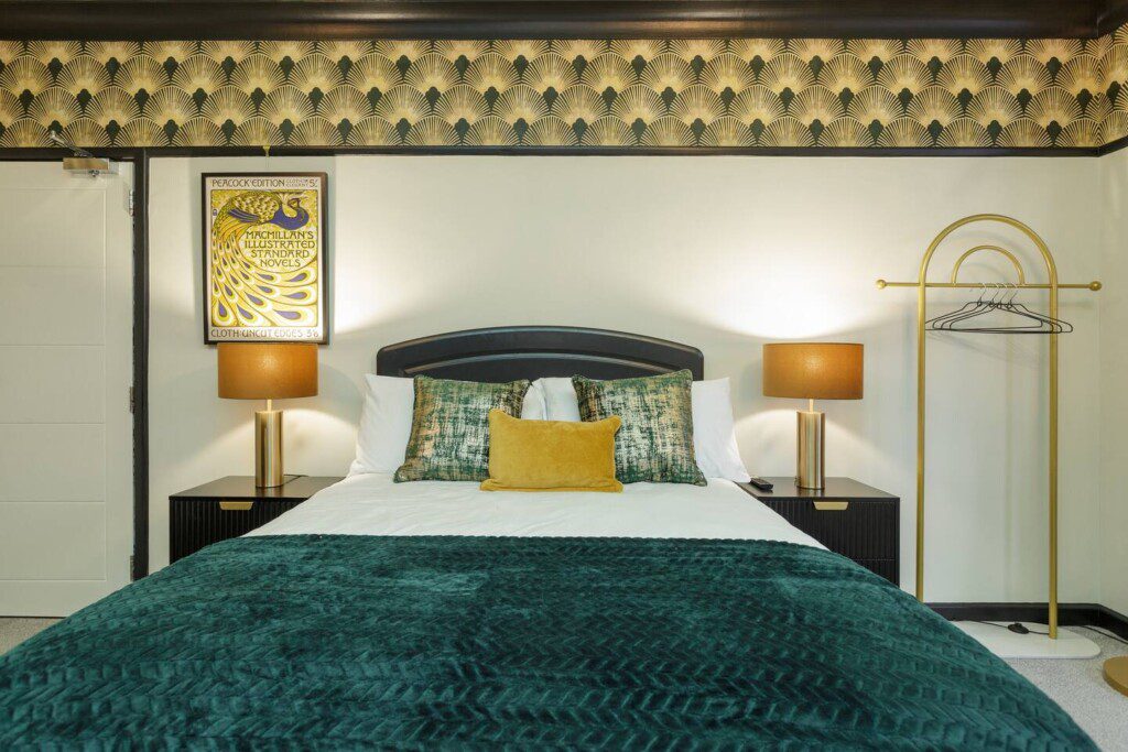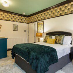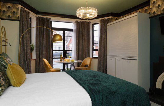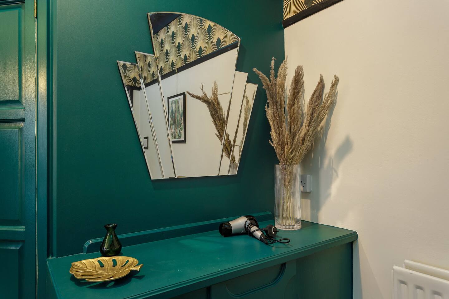Step into 1920s-inspired style in this Art Deco studio in Southsea. Rich emerald and gold tones and a decorative fireplace give the space real character. The studio includes a private en-suite shower, compact kitchenette, and a small dining nook by the Juliet balcony. Fast WiFi, smart TV, and Netflix are included. The seafront is around a 10–15 minute walk away. Well suited to couples, solo travellers, or business stays.