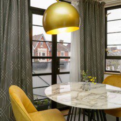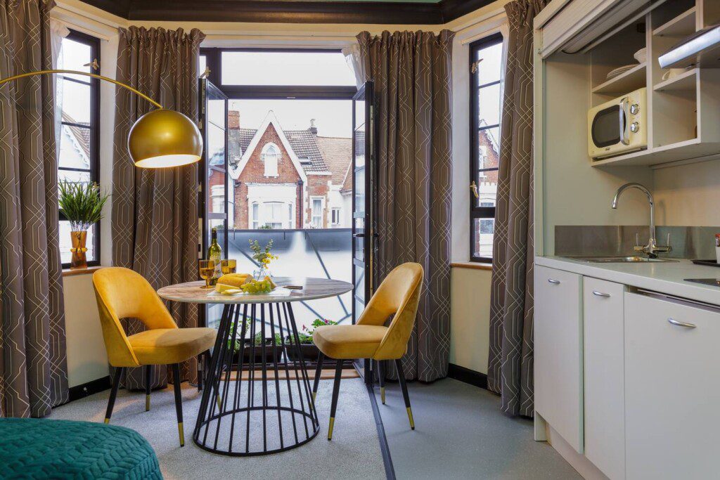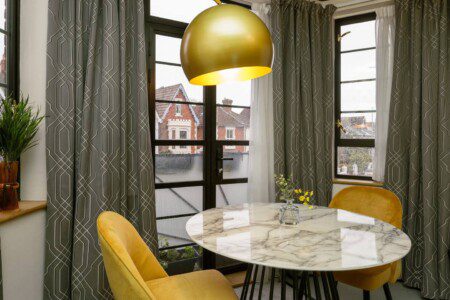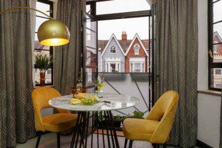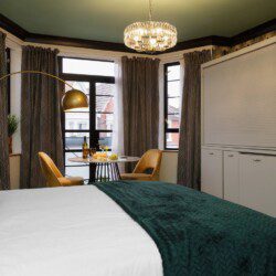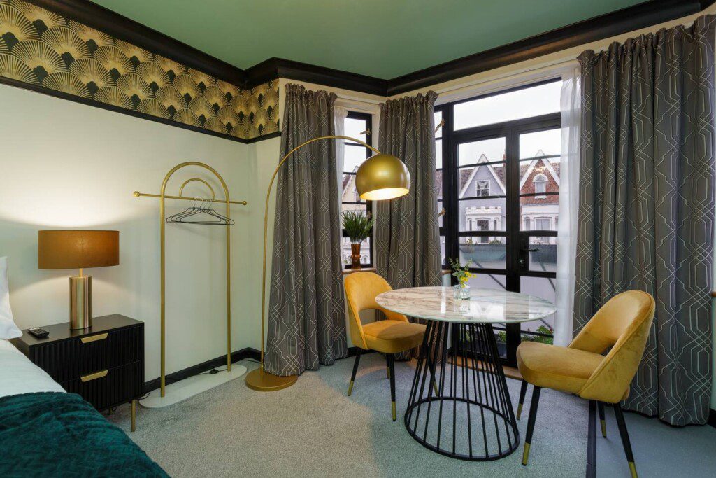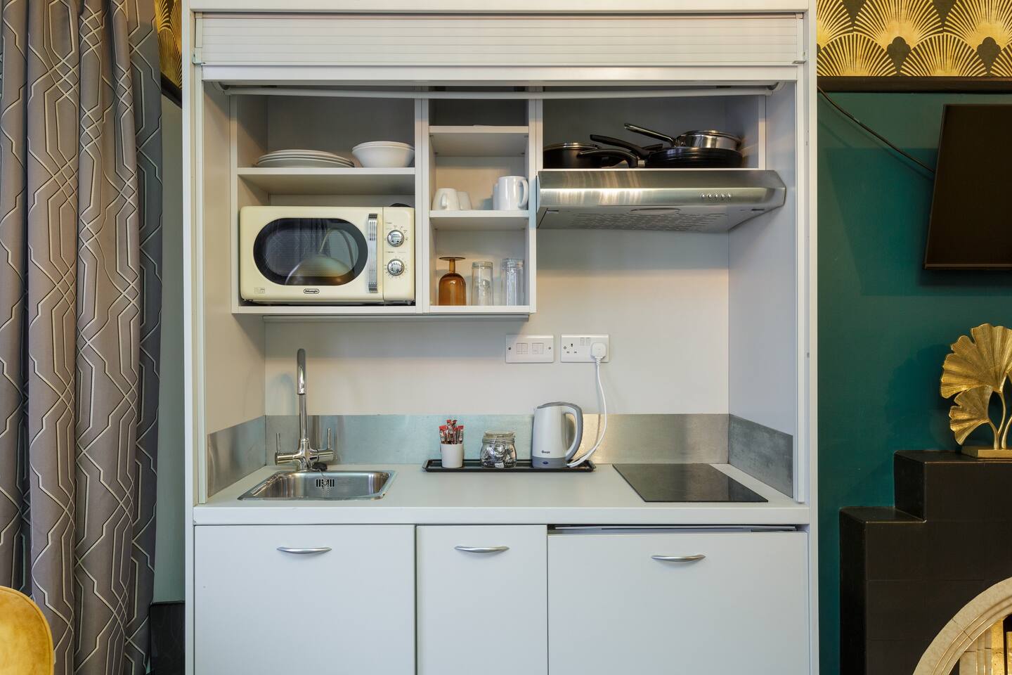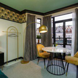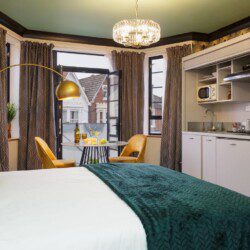 Step into a cosy Art Deco retreat with rich emerald-and-gold design touches and modern comfort. Studio 1 sits at the front of the building overlooking a lively street with bars and restaurants — perfect if you like being close to the action (light sleepers may prefer a rear studio).
