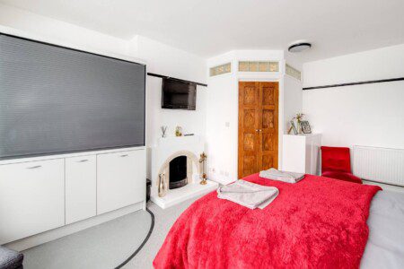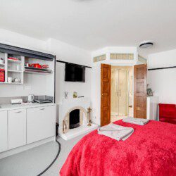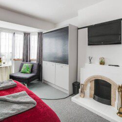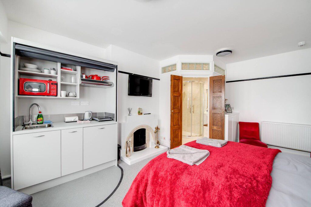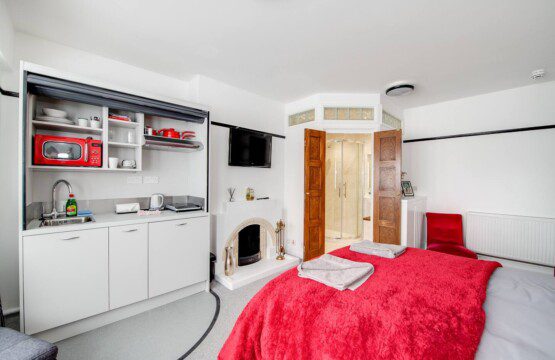 The studio gives guests ample space to relax and unwind, with a comfy double bed, 2 easy chairs and TV. The studio comes complete with a wardrobe, dressing table and dining table for eating or working. Perfect for 2 adults, or 2 adults and 1 child. The easy chairs click clack together to convert into a single bed.