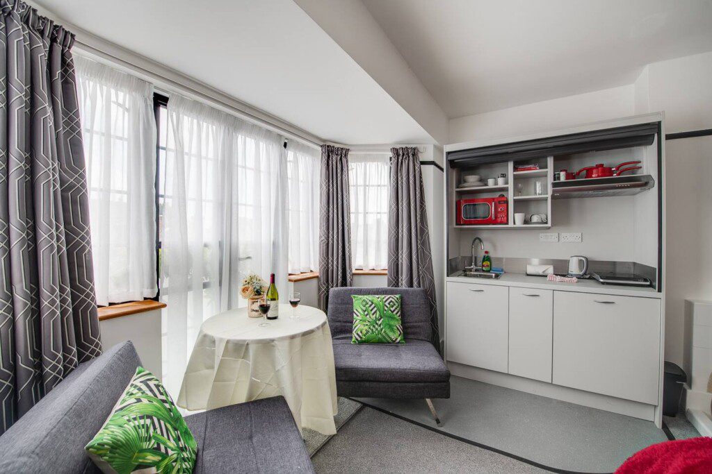 When it’s time to dine, the kitchenette includes basic essentials for cooking up a storm, including a single electric hob, microwave, utensils, crockery and glassware – so all you need is to get some goodies in!