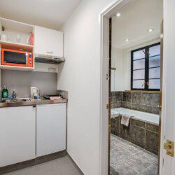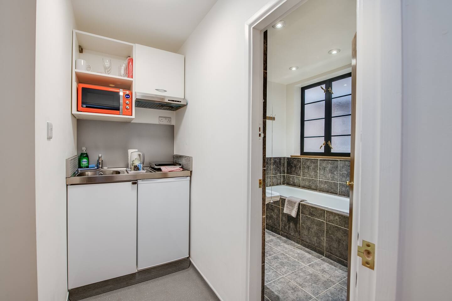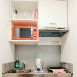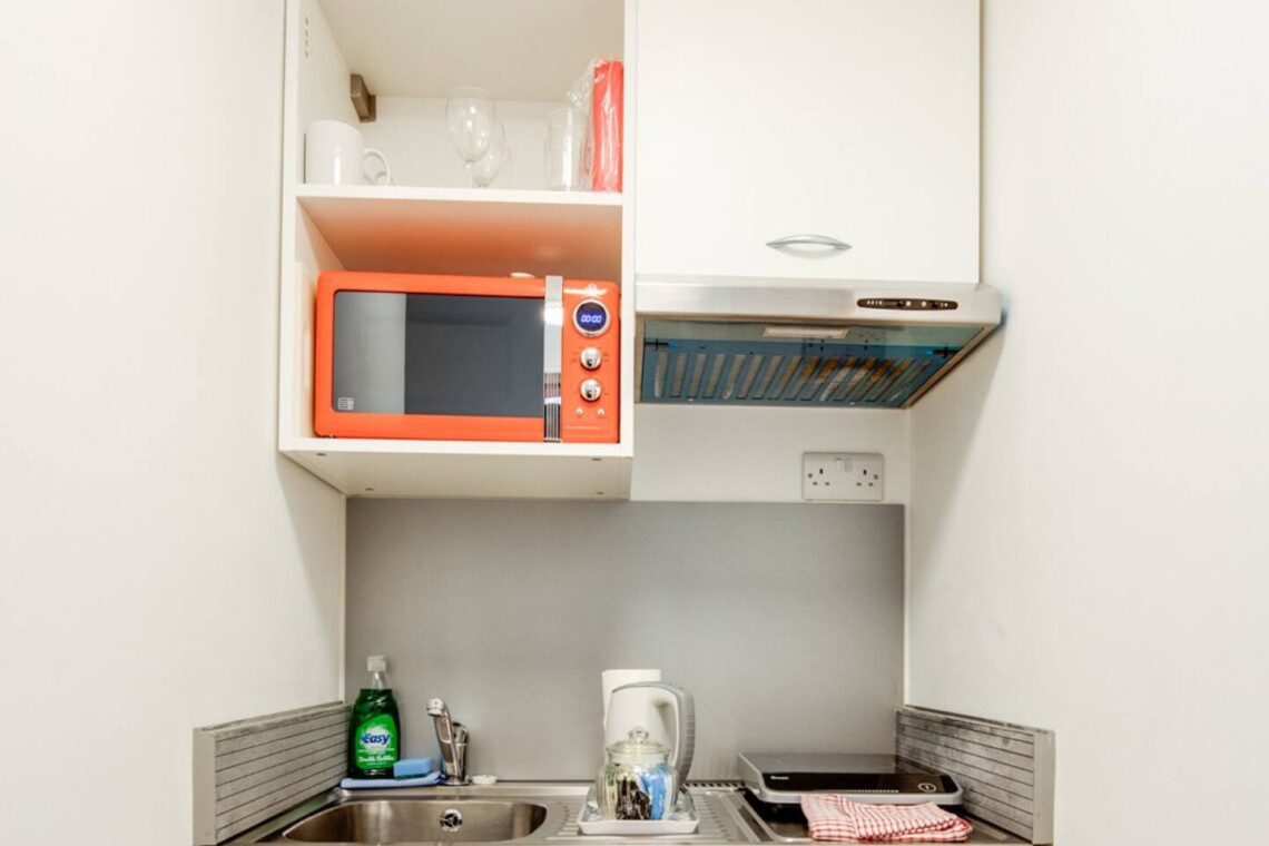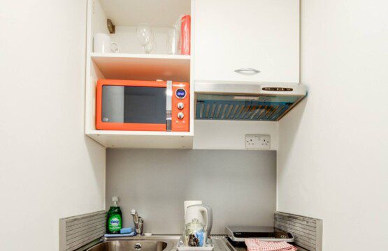 A separate door leads to a kitchenette providing basic essentials for cooking, including a single electric hob, microwave, utensils, crockery and glassware. *Please note there is no washing machine but there is a laundrette nearby.