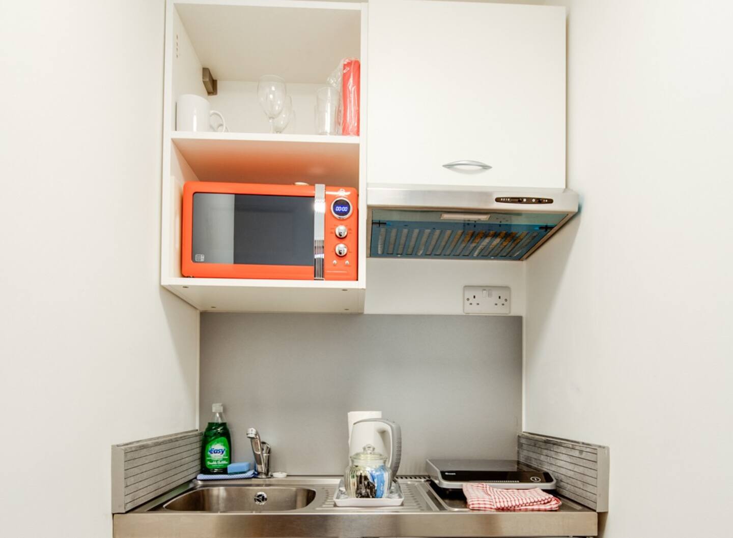 *Kitchenette with microwave, electric Hob, sink, Kettle & cooking utensils