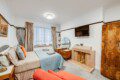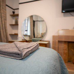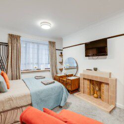 The generous studio gives guests ample space to relax and unwind, with a comfortable double bed, easy chair and television. This room comes complete with wardrobe, dressing table, and a table with chairs for dining or working. There is also a single futon bed which can be used for a child only.